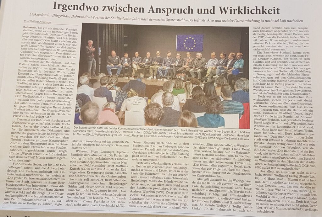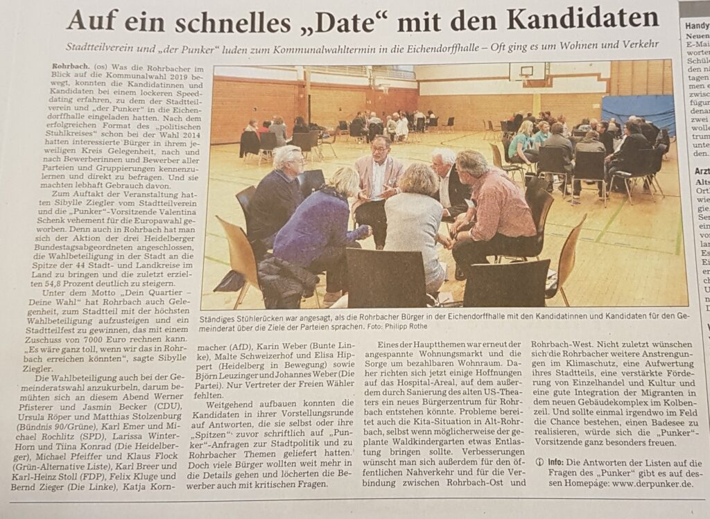 Wahlforum Bahnstadt mit Hans-Martin Mumm und SpeedDating in Rohrbach mit Michael Pfeiffer und Klaus Flock Rhein-Neckar Zeitung 21. Mai 2019